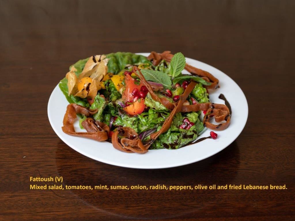 Fattoush€9.00Mixed salad, lettuce, tomatoes, mint, sumac, onion, radish, peppers, olives oil & fried Lebanese bread